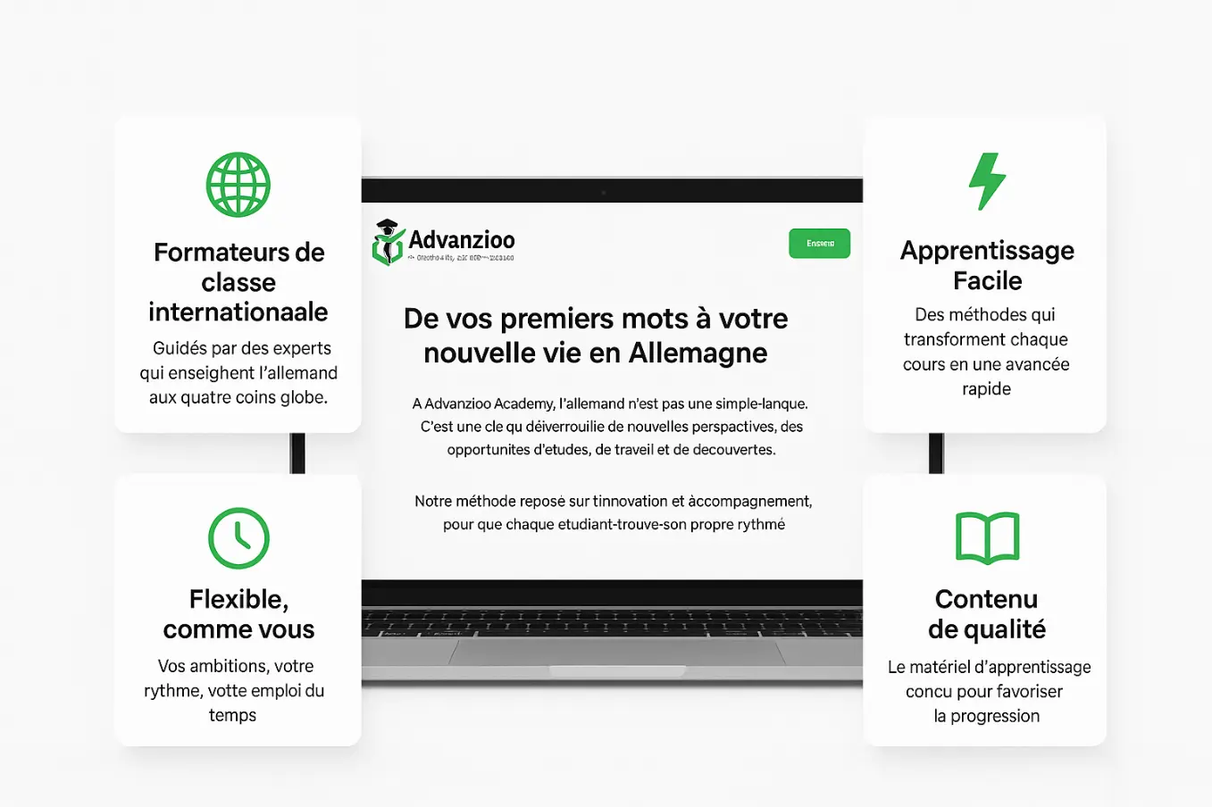 Chez Advanzioo Academy Tunisia, nous ne proposons pas seulement des cours d’allemand — nous offrons un véritable accompagnement vers votre avenir en Allemagne.